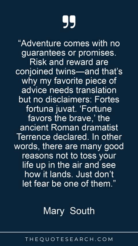 “Adventure comes with no guarantees or promises. Risk and reward are conjoined twins—and that’s why my favorite piece of advice needs translation but no disclaimers: Fortes fortuna juvat. ‘Fortune favors the brave,’ the ancient Roman dramatist Terrence declared. In other words, there are many good reasons not to toss your life up in the air and see how it lands. Just don’t let fear be one of them.”