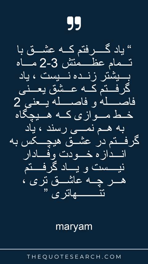 “ یاد گــــرفتم کــه عشـــق با تـــمام عظــــمتش 3-2 مـــاه بـــیشتر زنــده نـــیست ، یاد گرفـــتم کــه عـــشق یعـــنی فاصــــله و فاصــــله یــعنی 2 خــط مـــوازی کــه هـــیچگاه به هــم نمـــی رسند ، یاد گرفـــتم در عشــق هیچـــکس به انـــدازه خـــودت وفـــادار نیــــست و یـــاد گرفــــتم هـــر چــه عاشـــق تری ، تنــــــــهاتری ”