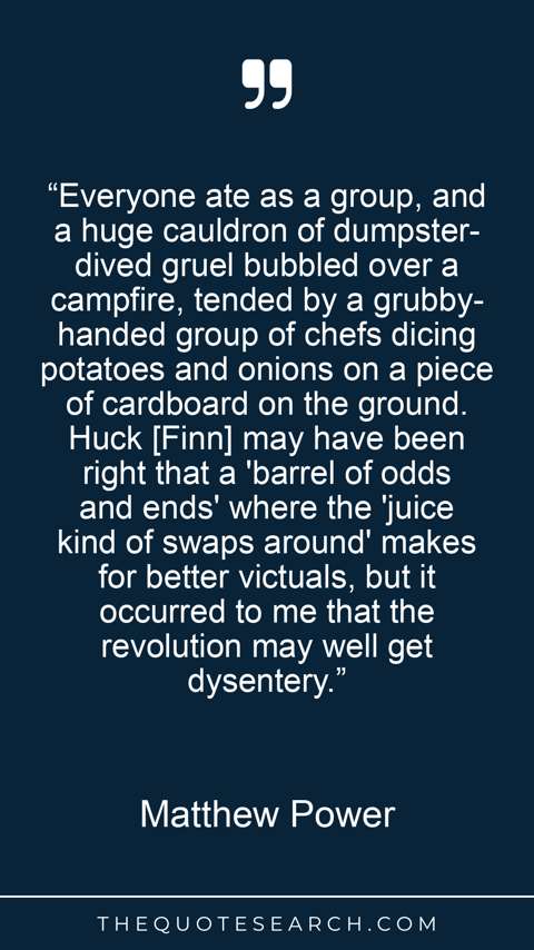 “Everyone ate as a group, and a huge cauldron of dumpster-dived gruel bubbled over a campfire, tended by a grubby-handed group of chefs dicing potatoes and onions on a piece of cardboard on the ground. Huck [Finn] may have been right that a 'barrel of odds and ends' where the 'juice kind of swaps around' makes for better victuals, but it occurred to me that the revolution may well get dysentery.”