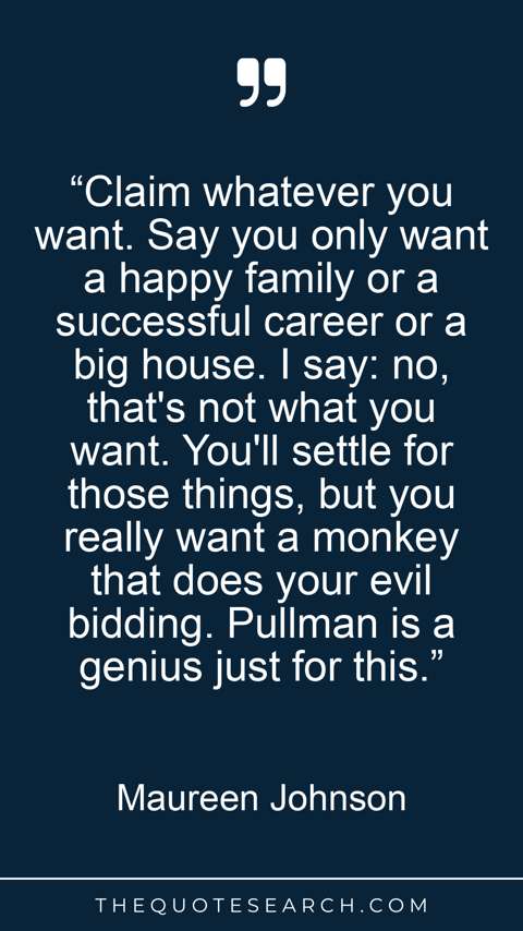 “Claim whatever you want. Say you only want a happy family or a successful career or a big house. I say: no, that's not what you want. You'll settle for those things, but you really want a monkey that does your evil bidding. Pullman is a genius just for this.”