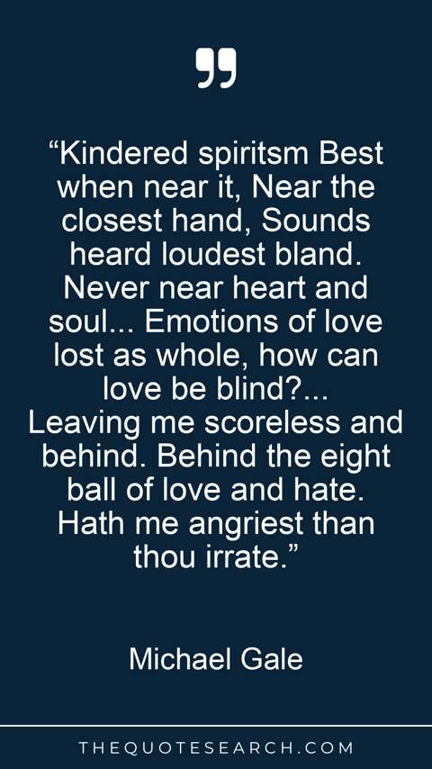 “Kindered spiritsm Best when near it, Near the closest hand, Sounds heard loudest bland. Never near heart and soul... Emotions of love lost as whole, how can love be blind?... Leaving me scoreless and behind. Behind the eight ball of love and hate. Hath me angriest than thou irrate.”