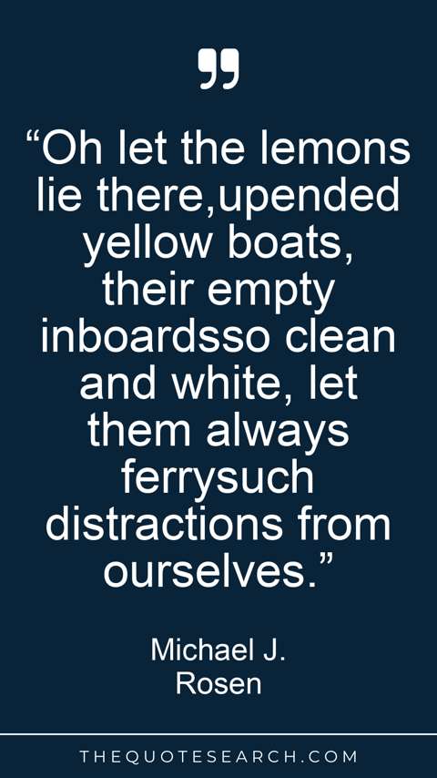 “Oh let the lemons lie there,upended yellow boats, their empty inboardsso clean and white, let them always ferrysuch distractions from ourselves.”