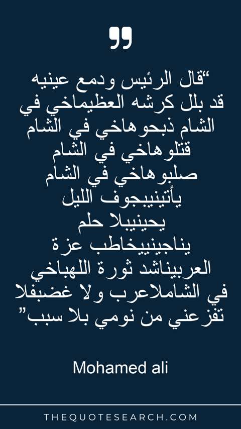 “قال الرئيس ودمع عينيه قد بلل كرشه العظيماخي في الشام ذبحوهاخي في الشام قتلوهاخي في الشام صلبوهاخي في الشام يأتينيبجوف الليل يحينيبلا حلم يناجينييخاطب عزة العربيناشد ثورة اللهباخي في الشاملاعرب ولا غضبفلا تفزعني من نومي بلا سبب”