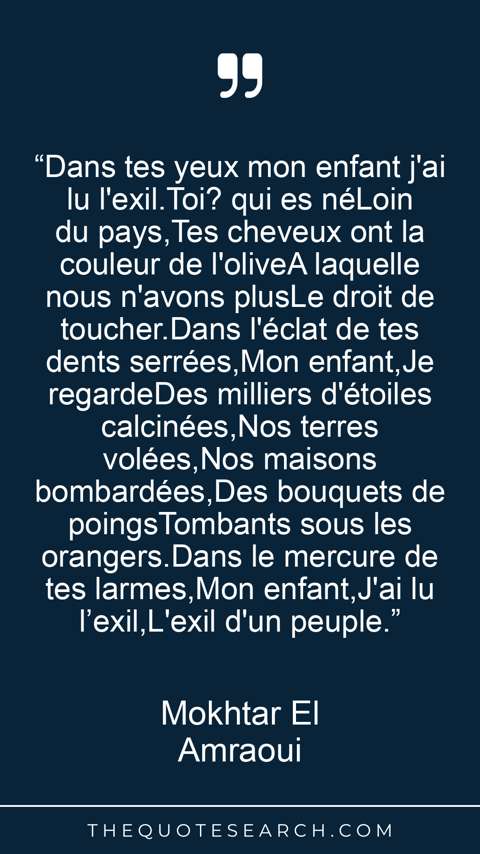 “Dans tes yeux mon enfant j'ai lu l'exil.Toi? qui es néLoin du pays,Tes cheveux ont la couleur de l'oliveA laquelle nous n'avons plusLe droit de toucher.Dans l'éclat de tes dents serrées,Mon enfant,Je regardeDes milliers d'étoiles calcinées,Nos terres volées,Nos maisons bombardées,Des bouquets de poingsTombants sous les orangers.Dans le mercure de tes larmes,Mon enfant,J'ai lu l’exil,L'exil d'un peuple.”
