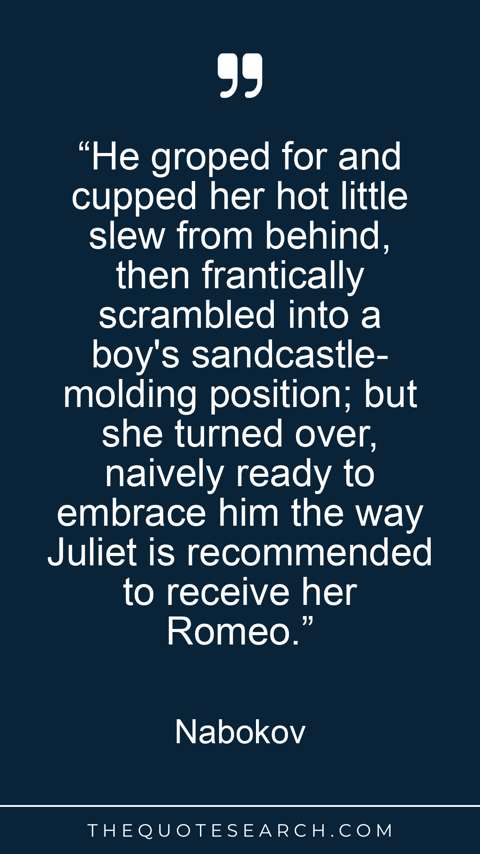 “In a nervous and slender-leaved mimosa grove at the back of their villa we found a perch on the ruins of a low stone wall. She trembled and twitched as I kissed the corner of her parted lips and the hot lobe of her ear. A cluster of stars palely glowed above us between the silhouettes of long thin leaves; that vibrant sky seemed as naked as she was under her light frock. I saw her face in the sky, strangely distinct, as if it emitted a faint radiance of its own. Her legs, her lovely live legs, were not too close together, and when my hand located what it sought, a dreamy and eerie expression, half-pleasure, half-pain, came over those childish features. She sat a little higher than I, and whenever in her solitary ecstasy she was led to kiss me, her head would bend with a sleepy, soft, drooping movement that was almost woeful, and her bare knees caught and compressed my wrist, and slackened again; and her quivering mouth, distorted by the acridity of some mysterious potion, with a sibilant intake of breath came near to my face. She would try to relieve the pain of love by first roughly rubbing her dry lips against mine; then my darling would draw away with a nervous toss of her hair, and then again come darkly near and let me feed on her open mouth, while with a generosity that was ready to offer her everything, my heart, my throat, my entrails, I gave her to hold in her awkward fist the scepter of my passion.”