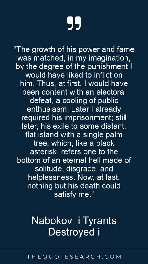 “The growth of his power and fame was matched, in my imagination, by the degree of the punishment I would have liked to inflict on him. Thus, at first, I would have been content with an electoral defeat, a cooling of public enthusiasm. Later I already required his imprisonment; still later, his exile to some distant, flat island with a single palm tree, which, like a black asterisk, refers one to the bottom of an eternal hell made of solitude, disgrace, and helplessness. Now, at last, nothing but his death could satisfy me.”