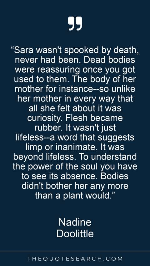 “Sara wasn't spooked by death, never had been. Dead bodies were reassuring once you got used to them. The body of her mother for instance--so unlike her mother in every way that all she felt about it was curiosity. Flesh became rubber. It wasn't just lifeless--a word that suggests limp or inanimate. It was beyond lifeless. To understand the power of the soul you have to see its absence. Bodies didn't bother her any more than a plant would.”