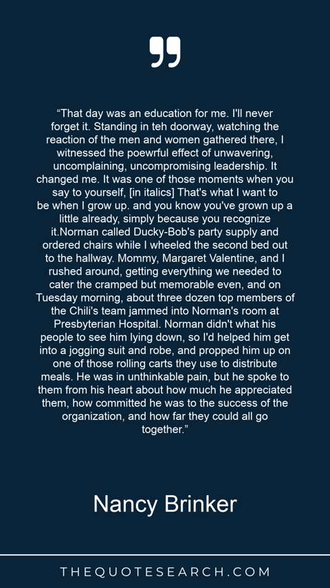 “That day was an education for me. I'll never forget it. Standing in teh doorway, watching the reaction of the men and women gathered there, I witnessed the poewrful effect of unwavering, uncomplaining, uncompromising leadership. It changed me. It was one of those moments when you say to yourself, [in italics] That's what I want to be when I grow up. and you know you've grown up a little already, simply because you recognize it.Norman called Ducky-Bob's party supply and ordered chairs while I wheeled the second bed out to the hallway. Mommy, Margaret Valentine, and I rushed around, getting everything we needed to cater the cramped but memorable even, and on Tuesday morning, about three dozen top members of the Chili's team jammed into Norman's room at Presbyterian Hospital. Norman didn't what his people to see him lying down, so I'd helped him get into a jogging suit and robe, and propped him up on one of those rolling carts they use to distribute meals. He was in unthinkable pain, but he spoke to them from his heart about how much he appreciated them, how committed he was to the success of the organization, and how far they could all go together.”