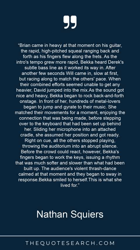 “Brian came in heavy at that moment on his guitar, the rapid, high-pitched squeal ranging back and forth as his fingers flew along the frets. As the intro's tempo grew more rapid, Bekka heard Derek's subtle bass line as it worked its way in. After another few seconds Will came in, slow at first, but racing along to match the others' pace. When their combined efforts seemed unable to get any heavier, David jumped into the mix.As the sound got nice and heavy, Bekka began to rock back-and-forth onstage. In front of her, hundreds of metal-lovers began to jump and gyrate to their music. She matched their movements for a moment, enjoying the connection that was being made, before stepping over to the keyboard that had been set up behind her. Sliding her microphone into an attached cradle, she assumed her position and got ready. Right on cue, all the others stopped playing, throwing the auditorium into an abrupt silence. Before the crowd could react, however, Bekka's fingers began to work the keys, issuing a rhythm that was much softer and slower than what had been built up. The audience's violent thrash-dance calmed at that moment and they began to sway in response.Bekka smiled to herself.This is what she lived for.”
