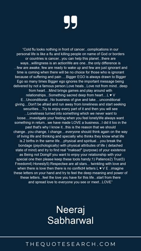 “Cold flu looks nothing in front of cancer...complications in our personal life is like a flu and killing people on name of God or borders or countries is cancer...you can help this planet...there are ways...willingness is an actionWe are one...the only difference is ...few are awake, few are ready to wake up and few are just ignorant and time is coming when there will be no choice for those who is ignorant because of suffering and pain ....Bigger EGO is always drawn to Bigger Ego so many times Bigger ego ignores the important message being delivered by not a famous person.Love heals...Love not from mind...deep from heart....Mind brings games and play around with relationships...Something sacred deep from heart....L ♥ V E...Unconditional...No business of give and take....unconditional giving....Don't be afraid and run away from loneliness and start seeking securities....Try to enjoy every part of it and then you will see ...Loneliness turned into something which we never want to loose....investigate your feeling when you feel lonelyWe always want something in return...we have made LOVE a business...I did it too in the past that's why I know it...this is the reason that we should change...you change, I change....everyone should think again on the way of living life and thinking and specially who thinks they know what life is.2 births in the same life....physical and spiritual....you break the bondage (psychologically) with physical attributes of life ( detached state of mind) and try to find real "maksad" (purpose) of your existence as Being not DoingIf you want to enjoy your relationship with your special one then please keep these tools handy:1) Patience2) Trust3) Freedom4) Honesty5) Respectwe are all stars... twinkling with love and when there is love then there is no conflict4 letters L ♥ V E ..imagine these letters on your hand and try to feel the deep meaning and power of these letters...feel the love you have for this life...start from there and spread love to everyone you see or meet...LOVE”