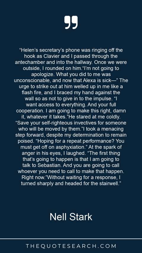 “Helen’s secretary’s phone was ringing off the hook as Clavier and I passed through the antechamber and into the hallway. Once we were outside, I rounded on him.“I’m not going to apologize. What you did to me was unconscionable, and now that Alexa is sick—” The urge to strike out at him welled up in me like a flash fire, and I braced my hand against the wall so as not to give in to the impulse. “I want access to everything. And your full cooperation. I am going to make this right, damn it, whatever it takes.”He stared at me coldly. “Save your self-righteous invectives for someone who will be moved by them.”I took a menacing step forward, despite my determination to remain poised. “Hoping for a repeat performance? You must get off on asphyxiation.” At the spark of anger in his eyes, I laughed. “The first thing that’s going to happen is that I am going to talk to Sebastian. And you are going to call whoever you need to call to make that happen. Right now.”Without waiting for a response, I turned sharply and headed for the stairwell.”
