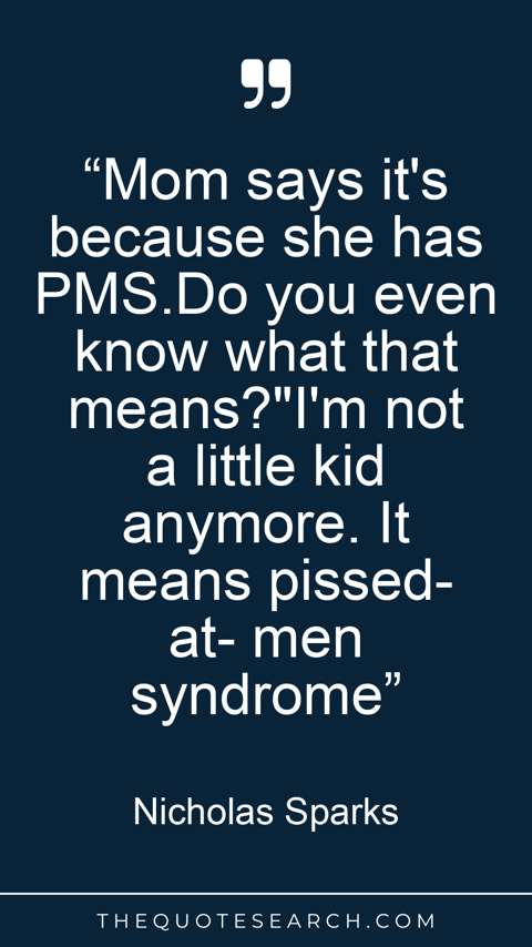 “Mom says it's because she has PMS.Do you even know what that means?"I'm not a little kid anymore. It means pissed-at- men syndrome”