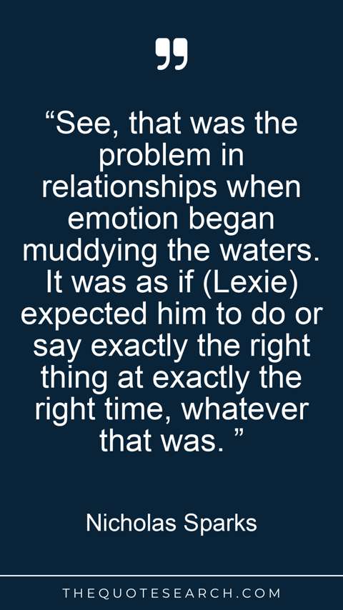 “See, that was the problem in relationships when emotion began muddying the waters. It was as if (Lexie) expected him to do or say exactly the right thing at exactly the right time, whatever that was. ”