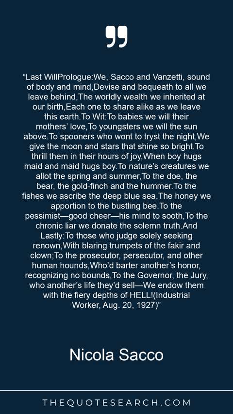 “Last WillPrologue:We, Sacco and Vanzetti, sound of body and mind,Devise and bequeath to all we leave behind,The worldly wealth we inherited at our birth,Each one to share alike as we leave this earth.To Wit:To babies we will their mothers’ love,To youngsters we will the sun above.To spooners who wont to tryst the night,We give the moon and stars that shine so bright.To thrill them in their hours of joy,When boy hugs maid and maid hugs boy.To nature’s creatures we allot the spring and summer,To the doe, the bear, the gold-finch and the hummer.To the fishes we ascribe the deep blue sea,The honey we apportion to the bustling bee.To the pessimist—good cheer—his mind to sooth,To the chronic liar we donate the solemn truth.And Lastly:To those who judge solely seeking renown,With blaring trumpets of the fakir and clown;To the prosecutor, persecutor, and other human hounds,Who’d barter another’s honor, recognizing no bounds,To the Governor, the Jury, who another’s life they’d sell—We endow them with the fiery depths of HELL!(Industrial Worker, Aug. 20, 1927)”