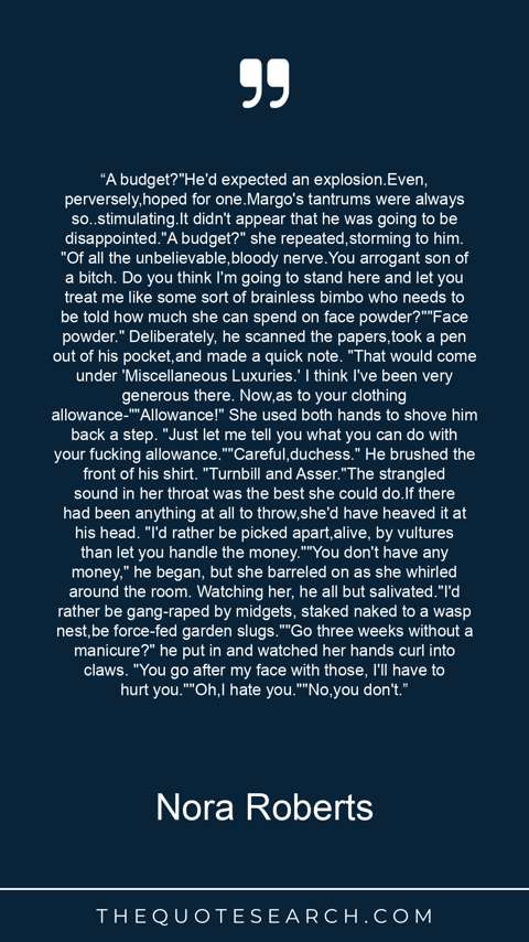 “A budget?"He'd expected an explosion.Even, perversely,hoped for one.Margo's tantrums were always so..stimulating.It didn't appear that he was going to be disappointed."A budget?" she repeated,storming to him. "Of all the unbelievable,bloody nerve.You arrogant son of a bitch. Do you think I'm going to stand here and let you treat me like some sort of brainless bimbo who needs to be told how much she can spend on face powder?""Face powder." Deliberately, he scanned the papers,took a pen out of his pocket,and made a quick note. "That would come under 'Miscellaneous Luxuries.' I think I've been very generous there. Now,as to your clothing allowance-""Allowance!" She used both hands to shove him back a step. "Just let me tell you what you can do with your fucking allowance.""Careful,duchess." He brushed the front of his shirt. "Turnbill and Asser."The strangled sound in her throat was the best she could do.If there had been anything at all to throw,she'd have heaved it at his head. "I'd rather be picked apart,alive, by vultures than let you handle the money.""You don't have any money," he began, but she barreled on as she whirled around the room. Watching her, he all but salivated."I'd rather be gang-raped by midgets, staked naked to a wasp nest,be force-fed garden slugs.""Go three weeks without a manicure?" he put in and watched her hands curl into claws. "You go after my face with those, I'll have to hurt you.""Oh,I hate you.""No,you don't.”