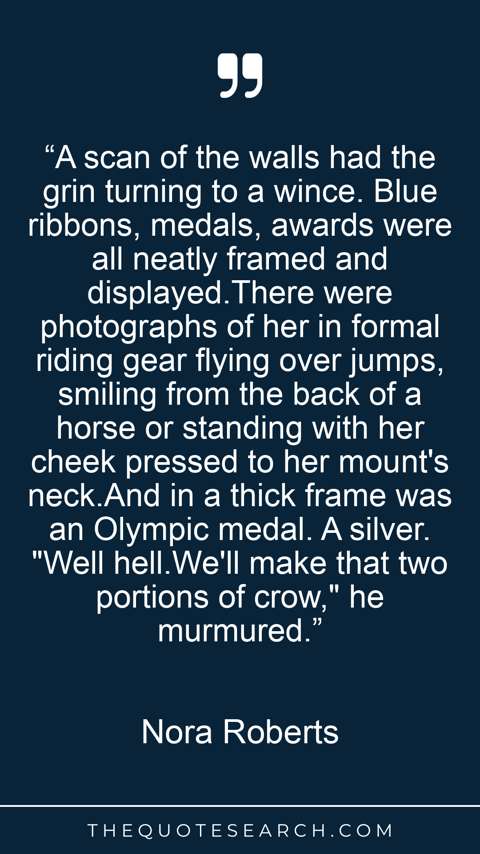 “A scan of the walls had the grin turning to a wince. Blue ribbons, medals, awards were all neatly framed and displayed.There were photographs of her in formal riding gear flying over jumps, smiling from the back of a horse or standing with her cheek pressed to her mount's neck.And in a thick frame was an Olympic medal. A silver. "Well hell.We'll make that two portions of crow," he murmured.”