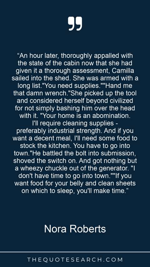 “An hour later, thoroughly appalled with the state of the cabin now that she had given it a thorough assessment, Camilla sailed into the shed. She was armed with a long list."You need supplies.""Hand me that damn wrench."She picked up the tool and considered herself beyond civilized for not simply bashing him over the head with it. "Your home is an abomination. I'll require cleaning supplies - preferably industrial strength. And if you want a decent meal, I'll need some food to stock the kitchen. You have to go into town."He battled the bolt into submission, shoved the switch on. And got nothing but a wheezy chuckle out of the generator. "I don't have time to go into town.""If you want food for your belly and clean sheets on which to sleep, you'll make time.”