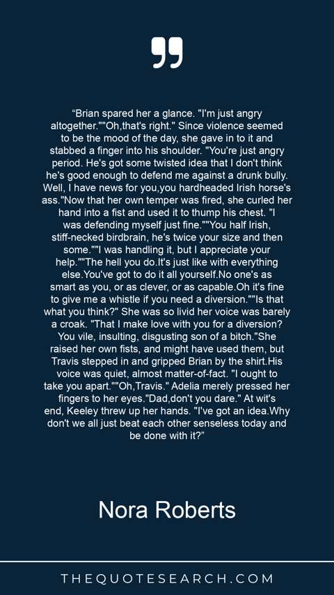 “Brian spared her a glance. "I'm just angry altogether.""Oh,that's right." Since violence seemed to be the mood of the day, she gave in to it and stabbed a finger into his shoulder. "You're just angry period. He's got some twisted idea that I don't think he's good enough to defend me against a drunk bully. Well, I have news for you,you hardheaded Irish horse's ass."Now that her own temper was fired, she curled her hand into a fist and used it to thump his chest. "I was defending myself just fine.""You half Irish, stiff-necked birdbrain, he's twice your size and then some.""I was handling it, but I appreciate your help.""The hell you do.It's just like with everything else.You've got to do it all yourself.No one's as smart as you, or as clever, or as capable.Oh it's fine to give me a whistle if you need a diversion.""Is that what you think?" She was so livid her voice was barely a croak. "That I make love with you for a diversion? You vile, insulting, disgusting son of a bitch."She raised her own fists, and might have used them, but Travis stepped in and gripped Brian by the shirt.His voice was quiet, almost matter-of-fact. "I ought to take you apart.""Oh,Travis." Adelia merely pressed her fingers to her eyes."Dad,don't you dare." At wit's end, Keeley threw up her hands. "I've got an idea.Why don't we all just beat each other senseless today and be done with it?”