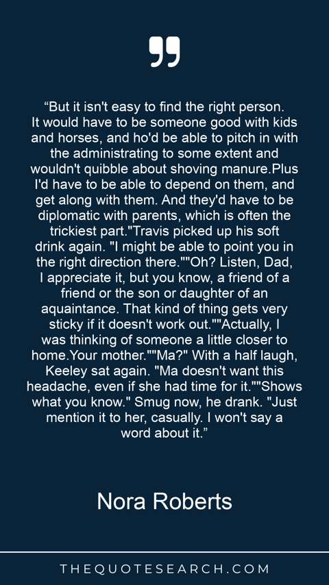 “But it isn't easy to find the right person. It would have to be someone good with kids and horses, and ho'd be able to pitch in with the administrating to some extent and wouldn't quibble about shoving manure.Plus I'd have to be able to depend on them, and get along with them. And they'd have to be diplomatic with parents, which is often the trickiest part."Travis picked up his soft drink again. "I might be able to point you in the right direction there.""Oh? Listen, Dad, I appreciate it, but you know, a friend of a friend or the son or daughter of an aquaintance. That kind of thing gets very sticky if it doesn't work out.""Actually, I was thinking of someone a little closer to home.Your mother.""Ma?" With a half laugh, Keeley sat again. "Ma doesn't want this headache, even if she had time for it.""Shows what you know." Smug now, he drank. "Just mention it to her, casually. I won't say a word about it.”
