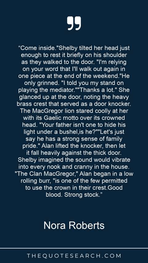 “Come inside."Shelby tilted her head just enough to rest it briefly on his shoulder as they walked to the door. "I'm relying on your word that I'll walk out again in one piece at the end of the weekend."He only grinned. "I told you my stand on playing the mediator.""Thanks a lot." She glanced up at the door, noting the heavy brass crest that served as a door knocker. The MacGregor lion stared coolly at her with its Gaelic motto over its crowned head. "Your father isn't one to hide his light under a bushel,is he?""Let's just say he has a strong sense of family pride." Alan lifted the knocker, then let it fall heavily against the thick door. Shelby imagined the sound would vibrate into every nook and cranny in the house. "The Clan MacGregor," Alan began in a low rolling burr, "is one of the few permitted to use the crown in their crest.Good blood. Strong stock.”