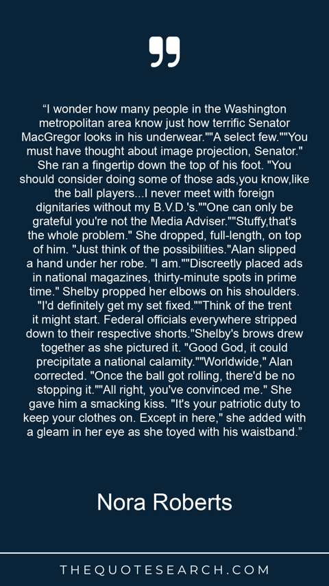 “I wonder how many people in the Washington metropolitan area know just how terrific Senator MacGregor looks in his underwear.""A select few.""You must have thought about image projection, Senator." She ran a fingertip down the top of his foot. "You should consider doing some of those ads,you know,like the ball players...I never meet with foreign dignitaries without my B.V.D.'s.""One can only be grateful you're not the Media Adviser.""Stuffy,that's the whole problem." She dropped, full-length, on top of him. "Just think of the possibilities."Alan slipped a hand under her robe. "I am.""Discreetly placed ads in national magazines, thirty-minute spots in prime time." Shelby propped her elbows on his shoulders. "I'd definitely get my set fixed.""Think of the trent it might start. Federal officials everywhere stripped down to their respective shorts."Shelby's brows drew together as she pictured it. "Good God, it could precipitate a national calamity.""Worldwide," Alan corrected. "Once the ball got rolling, there'd be no stopping it.""All right, you've convinced me." She gave him a smacking kiss. "It's your patriotic duty to keep your clothes on. Except in here," she added with a gleam in her eye as she toyed with his waistband.”