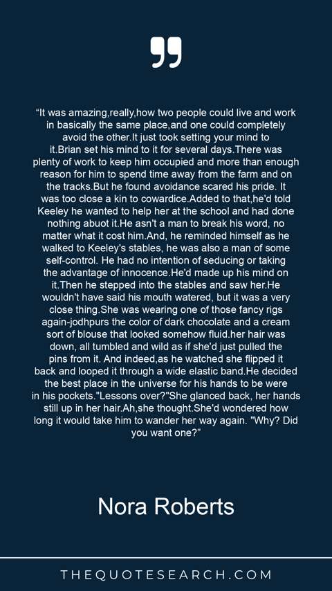 “It was amazing,really,how two people could live and work in basically the same place,and one could completely avoid the other.It just took setting your mind to it.Brian set his mind to it for several days.There was plenty of work to keep him occupied and more than enough reason for him to spend time away from the farm and on the tracks.But he found avoidance scared his pride. It was too close a kin to cowardice.Added to that,he'd told Keeley he wanted to help her at the school and had done nothing abuot it.He asn't a man to break his word, no matter what it cost him.And, he reminded himself as he walked to Keeley's stables, he was also a man of some self-control. He had no intention of seducing or taking the advantage of innocence.He'd made up his mind on it.Then he stepped into the stables and saw her.He wouldn't have said his mouth watered, but it was a very close thing.She was wearing one of those fancy rigs again-jodhpurs the color of dark chocolate and a cream sort of blouse that looked somehow fluid.her hair was down, all tumbled and wild as if she'd just pulled the pins from it. And indeed,as he watched she flipped it back and looped it through a wide elastic band.He decided the best place in the universe for his hands to be were in his pockets."Lessons over?"She glanced back, her hands still up in her hair.Ah,she thought.She'd wondered how long it would take him to wander her way again. "Why? Did you want one?”