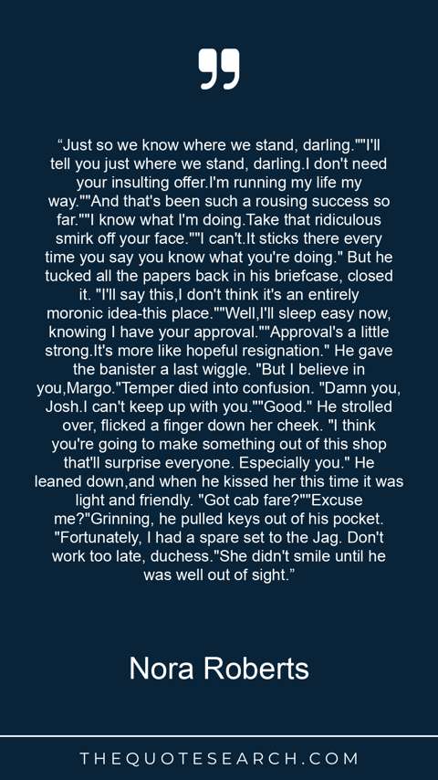 “Just so we know where we stand, darling.""I'll tell you just where we stand, darling.I don't need your insulting offer.I'm running my life my way.""And that's been such a rousing success so far.""I know what I'm doing.Take that ridiculous smirk off your face.""I can't.It sticks there every time you say you know what you're doing." But he tucked all the papers back in his briefcase, closed it. "I'll say this,I don't think it's an entirely moronic idea-this place.""Well,I'll sleep easy now, knowing I have your approval.""Approval's a little strong.It's more like hopeful resignation." He gave the banister a last wiggle. "But I believe in you,Margo."Temper died into confusion. "Damn you, Josh.I can't keep up with you.""Good." He strolled over, flicked a finger down her cheek. "I think you're going to make something out of this shop that'll surprise everyone. Especially you." He leaned down,and when he kissed her this time it was light and friendly. "Got cab fare?""Excuse me?"Grinning, he pulled keys out of his pocket. "Fortunately, I had a spare set to the Jag. Don't work too late, duchess."She didn't smile until he was well out of sight.”