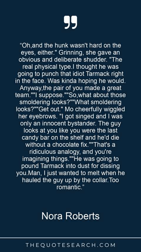 “Oh,and the hunk wasn't hard on the eyes, either." Grinning, she gave an obvious and deliberate shudder. "The real physical type.I thought he was going to punch that idiot Tarmack right in the face. Was kinda hoping he would. Anyway,the pair of you made a great team.""I suppose.""So,what about those smoldering looks?""What smoldering looks?""Get out." Mo cheerfully wiggled her eyebrows. "I got singed and I was only an innocent bystander. The guy looks at you like you were the last candy bar on the shelf and he'd die without a chocolate fix.""That's a ridiculous analogy, and you're imagining things.""He was going to pound Tarmack into dust for dissing you.Man, I just wanted to melt when he hauled the guy up by the collar.Too romantic.”