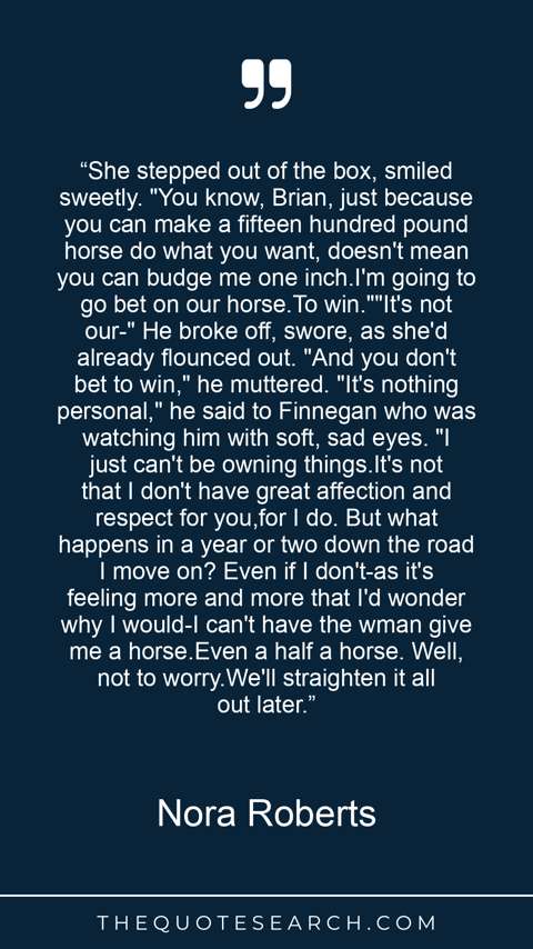 “She stepped out of the box, smiled sweetly. "You know, Brian, just because you can make a fifteen hundred pound horse do what you want, doesn't mean you can budge me one inch.I'm going to go bet on our horse.To win.""It's not our-" He broke off, swore, as she'd already flounced out. "And you don't bet to win," he muttered. "It's nothing personal," he said to Finnegan who was watching him with soft, sad eyes. "I just can't be owning things.It's not that I don't have great affection and respect for you,for I do. But what happens in a year or two down the road I move on? Even if I don't-as it's feeling more and more that I'd wonder why I would-I can't have the wman give me a horse.Even a half a horse. Well, not to worry.We'll straighten it all out later.”