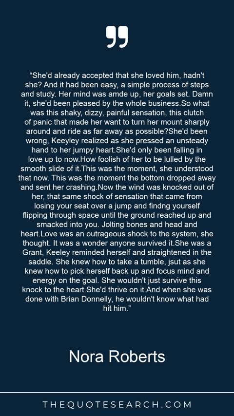 “She'd already accepted that she loved him, hadn't she? And it had been easy, a simple process of steps and study. Her mind was amde up, her goals set. Damn it, she'd been pleased by the whole business.So what was this shaky, dizzy, painful sensation, this clutch of panic that made her want to turn her mount sharply around and ride as far away as possible?She'd been wrong, Keeyley realized as she pressed an unsteady hand to her jumpy heart.She'd only been falling in love up to now.How foolish of her to be lulled by the smooth slide of it.This was the moment, she understood that now. This was the moment the bottom dropped away and sent her crashing.Now the wind was knocked out of her, that same shock of sensation that came from losing your seat over a jump and findng yourself flipping through space until the ground reached up and smacked into you. Jolting bones and head and heart.Love was an outrageous shock to the system, she thought. It was a wonder anyone survived it.She was a Grant, Keeley reminded herself and straightened in the saddle. She knew how to take a tumble, jsut as she knew how to pick herself back up and focus mind and energy on the goal. She wouldn't just survive this knock to the heart.She'd thrive on it.And when she was done with Brian Donnelly, he wouldn't know what had hit him.”