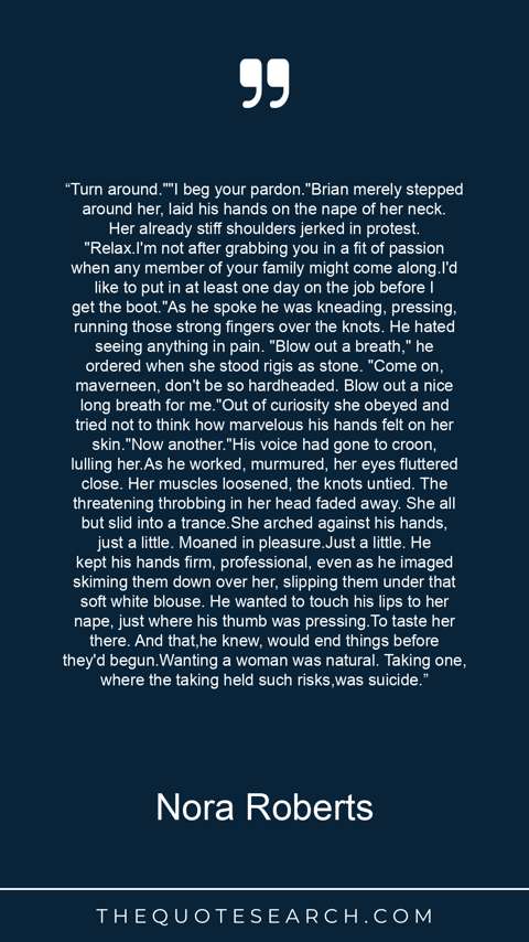 “Turn around.""I beg your pardon."Brian merely stepped around her, laid his hands on the nape of her neck. Her already stiff shoulders jerked in protest. "Relax.I'm not after grabbing you in a fit of passion when any member of your family might come along.I'd like to put in at least one day on the job before I get the boot."As he spoke he was kneading, pressing, running those strong fingers over the knots. He hated seeing anything in pain. "Blow out a breath," he ordered when she stood rigis as stone. "Come on, maverneen, don't be so hardheaded. Blow out a nice long breath for me."Out of curiosity she obeyed and tried not to think how marvelous his hands felt on her skin."Now another."His voice had gone to croon, lulling her.As he worked, murmured, her eyes fluttered close. Her muscles loosened, the knots untied. The threatening throbbing in her head faded away. She all but slid into a trance.She arched against his hands, just a little. Moaned in pleasure.Just a little. He kept his hands firm, professional, even as he imaged skiming them down over her, slipping them under that soft white blouse. He wanted to touch his lips to her nape, just where his thumb was pressing.To taste her there. And that,he knew, would end things before they'd begun.Wanting a woman was natural. Taking one, where the taking held such risks,was suicide.”
