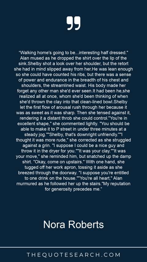 “Walking home's going to be...interesting half dressed." Alan mused as he dropped the shirt over the lip of the sink.Shelby shot a look over her shoulder, but the retort she had in mind slipped away from her.He was lean enough so she could have counted his ribs, but there was a sense of power and endurance in the breadth of his chest and shoulders, the streamlined waist. His body made her forget any other man she'd ever seen.It had been he,she realized all at once, whom she'd been thinking of when she'd thrown the clay into that clean-lined bowl.Shelby let the first flow of arousal rush through her because it was as sweet as it was sharp. Then she tensed against it, rendering it a distant throb she could control."You're in excellent shape," she commented lightly. "You should be able to make it to P street in under three minutes at a steady jog.""Shelby, that's downright unfriendly.""I thought it was more rude," she corrected as she struggled against a grin. "I suppose I could be a nice guy and throw it in the dryer for you.""It was your clay.""It was your move," she reminded him, but snatched up the damp shirt. "Okay, come on upstairs." With one hand, she tugged off her work apron, tossing it aside as she breezed through the doorway. "I suppose you're entitled to one drink on the house.""You're all heart," Alan murmured as he followed her up the stairs."My reputation for generosity precedes me.”