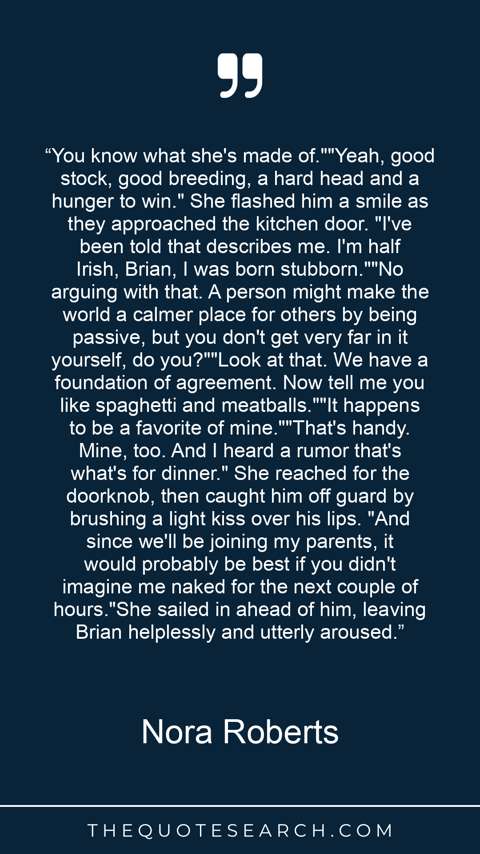 “You know what she's made of.""Yeah, good stock, good breeding, a hard head and a hunger to win." She flashed him a smile as they approached the kitchen door. "I've been told that describes me. I'm half Irish, Brian, I was born stubborn.""No arguing with that. A person might make the world a calmer place for others by being passive, but you don't get very far in it yourself, do you?""Look at that. We have a foundation of agreement. Now tell me you like spaghetti and meatballs.""It happens to be a favorite of mine.""That's handy. Mine, too. And I heard a rumor that's what's for dinner." She reached for the doorknob, then caught him off guard by brushing a light kiss over his lips. "And since we'll be joining my parents, it would probably be best if you didn't imagine me naked for the next couple of hours."She sailed in ahead of him, leaving Brian helplessly and utterly aroused.”