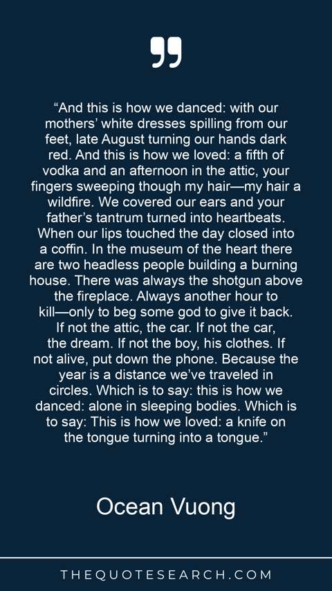 “And this is how we danced: with our mothers’ white dresses spilling from our feet, late August turning our hands dark red. And this is how we loved: a fifth of vodka and an afternoon in the attic, your fingers sweeping though my hair—my hair a wildfire. We covered our ears and your father’s tantrum turned into heartbeats. When our lips touched the day closed into a coffin. In the museum of the heart there are two headless people building a burning house. There was always the shotgun above the fireplace. Always another hour to kill—only to beg some god to give it back. If not the attic, the car. If not the car, the dream. If not the boy, his clothes. If not alive, put down the phone. Because the year is a distance we’ve traveled in circles. Which is to say: this is how we danced: alone in sleeping bodies. Which is to say: This is how we loved: a knife on the tongue turning into a tongue.”