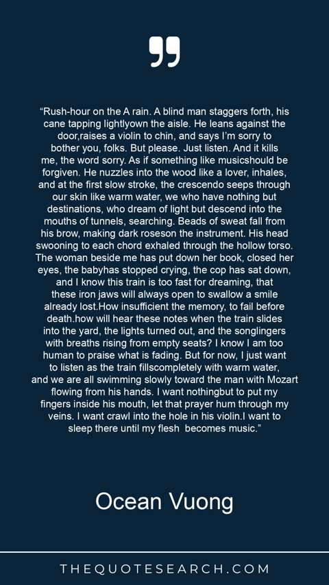 “Rush-hour on the A rain. A blind man staggers forth, his cane tapping lightlyown the aisle. He leans against the door,raises a violin to chin, and says I’m sorry to bother you, folks. But please. Just listen. And it kills me, the word sorry. As if something like musicshould be forgiven. He nuzzles into the wood like a lover, inhales, and at the first slow stroke, the crescendo seeps through our skin like warm water, we who have nothing but destinations, who dream of light but descend into the mouths of tunnels, searching. Beads of sweat fall from his brow, making dark roseson the instrument. His head swooning to each chord exhaled through the hollow torso. The woman beside me has put down her book, closed her eyes, the babyhas stopped crying, the cop has sat down, and I know this train is too fast for dreaming, that these iron jaws will always open to swallow a smile already lost.How insufficient the memory, to fail before death.how will hear these notes when the train slides into the yard, the lights turned out, and the songlingers with breaths rising from empty seats? I know I am too human to praise what is fading. But for now, I just want to listen as the train fillscompletely with warm water, and we are all swimming slowly toward the man with Mozart flowing from his hands. I want nothingbut to put my fingers inside his mouth, let that prayer hum through my veins. I want crawl into the hole in his violin.I want to sleep there until my flesh becomes music.”