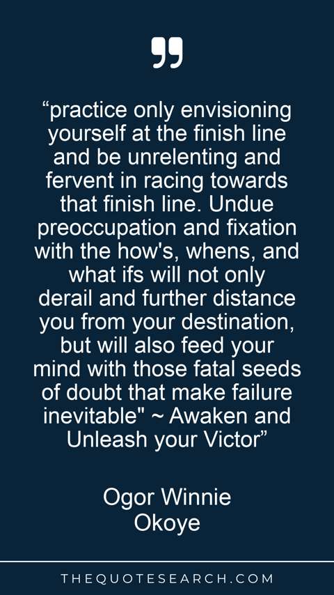 “practice only envisioning yourself at the finish line and be unrelenting and fervent in racing towards that finish line. Undue preoccupation and fixation with the how's, whens, and what ifs will not only derail and further distance you from your destination, but will also feed your mind with those fatal seeds of doubt that make failure inevitable" ~ Awaken and Unleash your Victor”