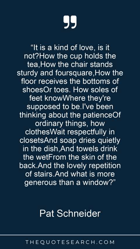 “It is a kind of love, is it not?How the cup holds the tea,How the chair stands sturdy and foursquare,How the floor receives the bottoms of shoesOr toes. How soles of feet knowWhere they're supposed to be.I've been thinking about the patienceOf ordinary things, how clothesWait respectfully in closetsAnd soap dries quietly in the dish,And towels drink the wetFrom the skin of the back.And the lovely repetition of stairs.And what is more generous than a window?”