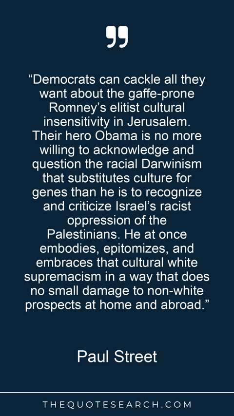 “Democrats can cackle all they want about the gaffe-prone Romney’s elitist cultural insensitivity in Jerusalem. Their hero Obama is no more willing to acknowledge and question the racial Darwinism that substitutes culture for genes than he is to recognize and criticize Israel’s racist oppression of the Palestinians. He at once embodies, epitomizes, and embraces that cultural white supremacism in a way that does no small damage to non-white prospects at home and abroad.”