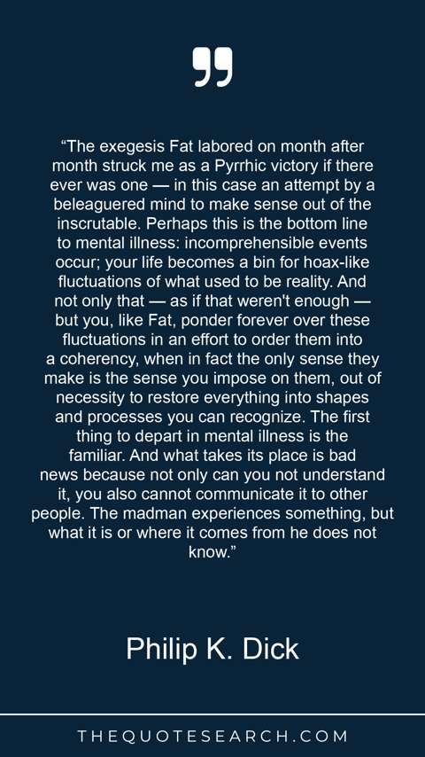 “The exegesis Fat labored on month after month struck me as a Pyrrhic victory if there ever was one — in this case an attempt by a beleaguered mind to make sense out of the inscrutable. Perhaps this is the bottom line to mental illness: incomprehensible events occur; your life becomes a bin for hoax-like fluctuations of what used to be reality. And not only that — as if that weren't enough — but you, like Fat, ponder forever over these fluctuations in an effort to order them into a coherency, when in fact the only sense they make is the sense you impose on them, out of necessity to restore everything into shapes and processes you can recognize. The first thing to depart in mental illness is the familiar. And what takes its place is bad news because not only can you not understand it, you also cannot communicate it to other people. The madman experiences something, but what it is or where it comes from he does not know.”