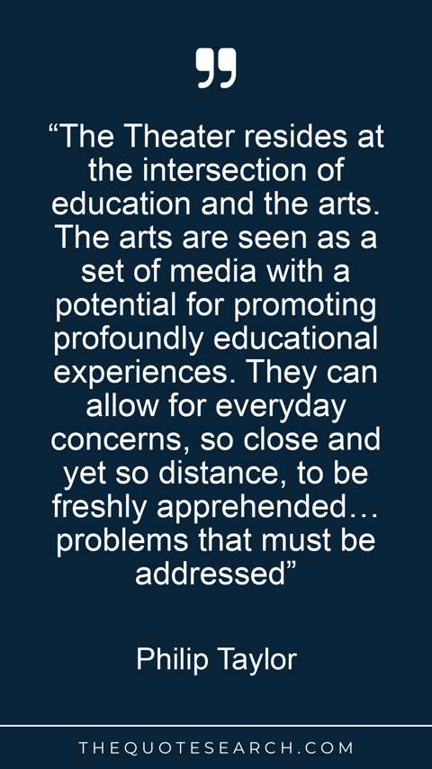 “The Theater resides at the intersection of education and the arts. The arts are seen as a set of media with a potential for promoting profoundly educational experiences. They can allow for everyday concerns, so close and yet so distance, to be freshly apprehended… problems that must be addressed”