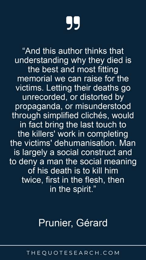 “And this author thinks that understanding why they died is the best and most fitting memorial we can raise for the victims. Letting their deaths go unrecorded, or distorted by propaganda, or misunderstood through simplified clichés, would in fact bring the last touch to the killers' work in completing the victims' dehumanisation. Man is largely a social construct and to deny a man the social meaning of his death is to kill him twice, first in the flesh, then in the spirit.”