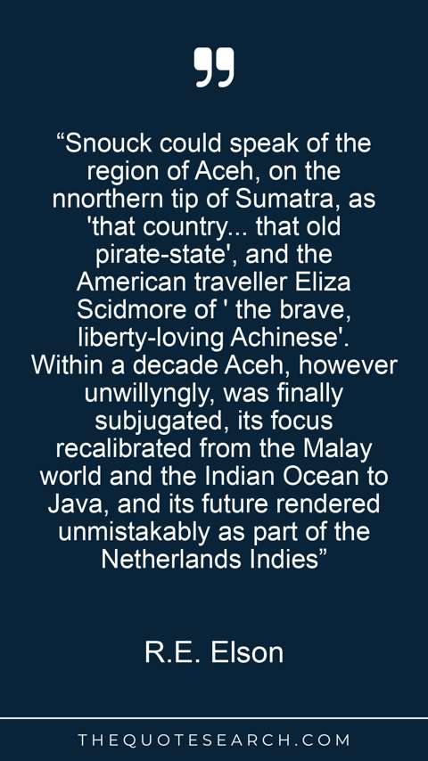 “Snouck could speak of the region of Aceh, on the nnorthern tip of Sumatra, as 'that country... that old pirate-state', and the American traveller Eliza Scidmore of ' the brave, liberty-loving Achinese'. Within a decade Aceh, however unwillyngly, was finally subjugated, its focus recalibrated from the Malay world and the Indian Ocean to Java, and its future rendered unmistakably as part of the Netherlands Indies”