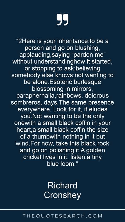 “2Here is your inheritance:to be a person and go on blushing, applauding,saying “pardon me” without understandinghow it started, or stopping to ask;believing somebody else knows;not wanting to be alone.Esoteric burlesque blossoming in mirrors, paraphernalia,rainbows, dolorous sombreros, days.The same presence everywhere. Look for it, it eludes you.Not wanting to be the only onewith a small black coffin in your heart,a small black coffin the size of a thumbwith nothing in it but wind.For now, take this black rock and go on polishing it.A golden cricket lives in it, listen;a tiny blue loom.”