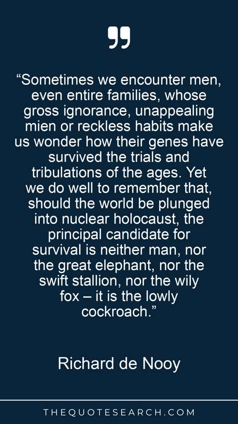 “Sometimes we encounter men, even entire families, whose gross ignorance, unappealing mien or reckless habits make us wonder how their genes have survived the trials and tribulations of the ages. Yet we do well to remember that, should the world be plunged into nuclear holocaust, the principal candidate for survival is neither man, nor the great elephant, nor the swift stallion, nor the wily fox – it is the lowly cockroach.”