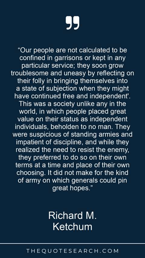 “Our people are not calculated to be confined in garrisons or kept in any particular service; they soon grow troublesome and uneasy by reflecting on their folly in bringing themselves into a state of subjection when they might have continued free and independent'. This was a society unlike any in the world, in which people placed great value on their status as independent individuals, beholden to no man. They were suspicious of standing armies and impatient of discipline, and while they realized the need to resist the enemy, they preferred to do so on their own terms at a time and place of their own choosing. It did not make for the kind of army on which generals could pin great hopes.”