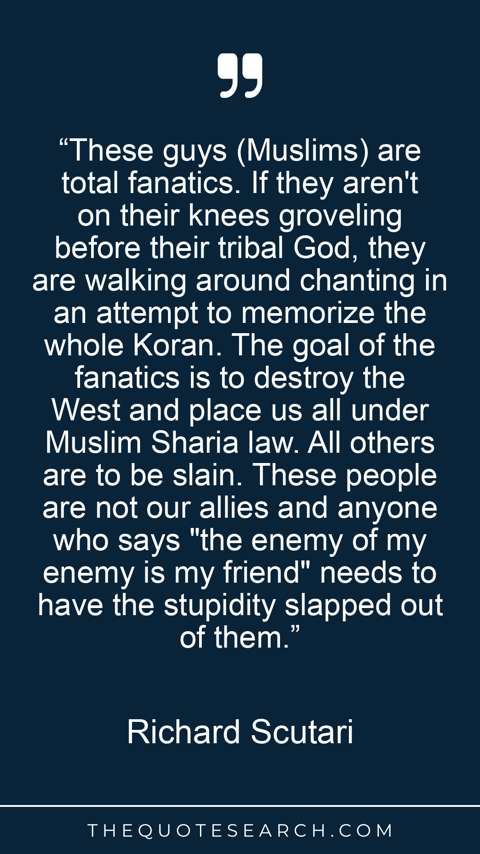 “These guys (Muslims) are total fanatics. If they aren't on their knees groveling before their tribal God, they are walking around chanting in an attempt to memorize the whole Koran. The goal of the fanatics is to destroy the West and place us all under Muslim Sharia law. All others are to be slain. These people are not our allies and anyone who says "the enemy of my enemy is my friend" needs to have the stupidity slapped out of them.”