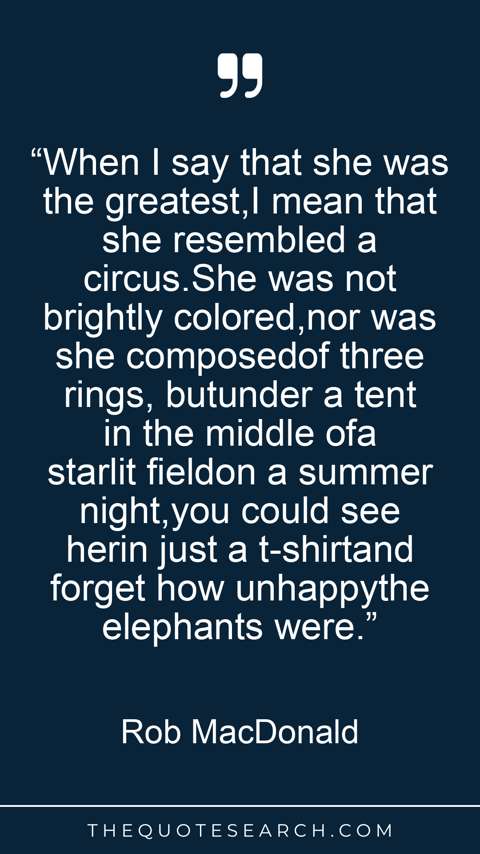 “When I say that she was the greatest,I mean that she resembled a circus.She was not brightly colored,nor was she composedof three rings, butunder a tent in the middle ofa starlit fieldon a summer night,you could see herin just a t-shirtand forget how unhappythe elephants were.”