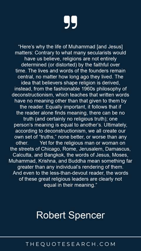 “Here’s why the life of Muhammad [and Jesus] matters: Contrary to what many secularists would have us believe, religions are not entirely determined (or distorted) by the faithful over time. The lives and words of the founders remain central, no matter how long ago they lived. The idea that believers shape religion is derived, instead, from the fashionable 1960s philosophy of deconstructionism, which teaches that written words have no meaning other than that given to them by the reader. Equally important, it follows that if the reader alone finds meaning, there can be no truth (and certainly no religious truth); one person’s meaning is equal to another’s. Ultimately, according to deconstructionism, we all create our own set of “truths,” none better, or worse than any other. Yet for the religious man or woman on the streets of Chicago, Rome, Jerusalem, Damascus, Calcutta, and Bangkok, the words of Jesus, Moses, Muhammad, Krishna, and Buddha mean something far greater than any individual’s rendering of them. And even to the less-than-devout reader, the words of these great religious leaders are clearly not equal in their meaning.”