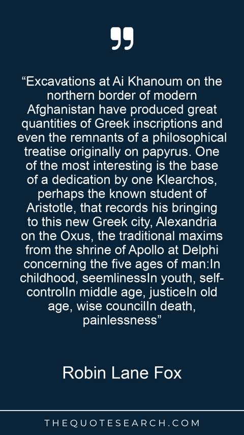 “Excavations at Ai Khanoum on the northern border of modern Afghanistan have produced great quantities of Greek inscriptions and even the remnants of a philosophical treatise originally on papyrus. One of the most interesting is the base of a dedication by one Klearchos, perhaps the known student of Aristotle, that records his bringing to this new Greek city, Alexandria on the Oxus, the traditional maxims from the shrine of Apollo at Delphi concerning the five ages of man:In childhood, seemlinessIn youth, self-controlIn middle age, justiceIn old age, wise councilIn death, painlessness”