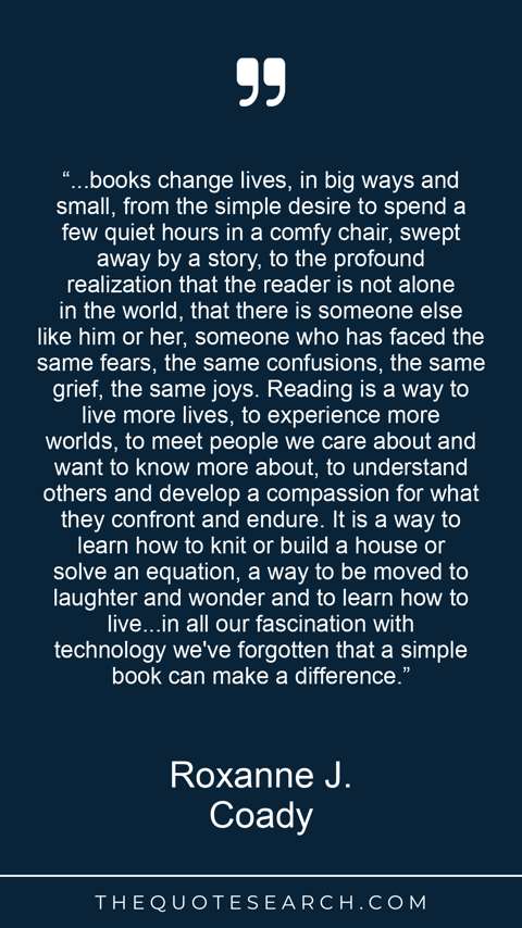 “...books change lives, in big ways and small, from the simple desire to spend a few quiet hours in a comfy chair, swept away by a story, to the profound realization that the reader is not alone in the world, that there is someone else like him or her, someone who has faced the same fears, the same confusions, the same grief, the same joys. Reading is a way to live more lives, to experience more worlds, to meet people we care about and want to know more about, to understand others and develop a compassion for what they confront and endure. It is a way to learn how to knit or build a house or solve an equation, a way to be moved to laughter and wonder and to learn how to live...in all our fascination with technology we've forgotten that a simple book can make a difference.”